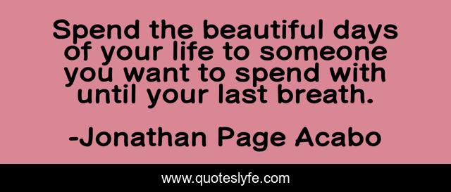 This page presents the quote "Spend the beautiful days of your life to someone you want to spend with until your last breath.". Author of this quote is Jonathan Page Acabo. This quote is about beautiful, enthusiasm, life, purpose-of-life, inspirational,.