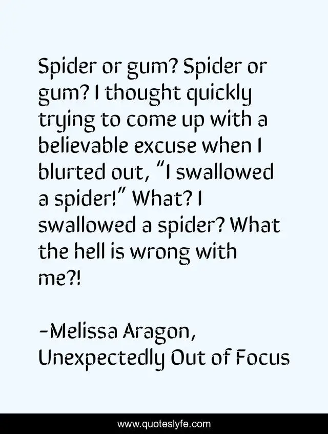 This page presents the quote "Spider or gum? Spider or gum? I thought quickly trying to come up with a believable excuse when I blurted out, “I swallowed a spider!” What? I swallowed a spider? What the hell is wrong with me?!". Author of this quote is Melissa Aragon, Unexpectedly Out of Focus. .