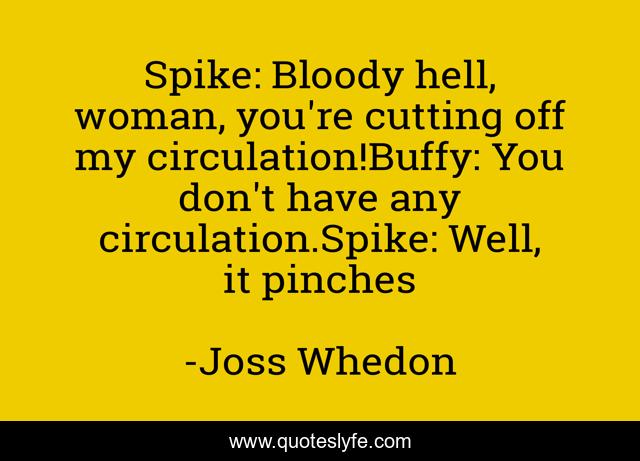 This page presents the quote "Spike: Bloody hell, woman, you're cutting off my circulation!Buffy: You don't have any circulation.Spike: Well, it pinches". Author of this quote is Joss Whedon. .
