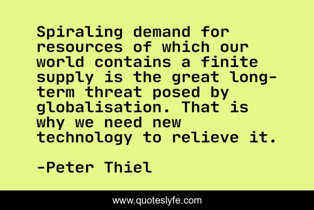 This page presents the quote "Spiraling demand for resources of which our world contains a finite supply is the great long-term threat posed by globalisation. That is why we need new technology to relieve it.". Author of this quote is Peter Thiel. This quote is about world, great, why,.