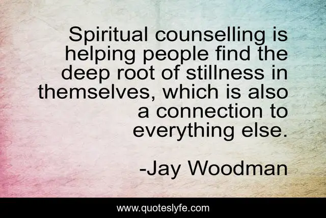 This page presents the quote "Spiritual counselling is helping people find the deep root of stillness in themselves, which is also a connection to everything else.". Author of this quote is Jay Woodman. This quote is about stillness, counselling, root, connection, spiritual,.