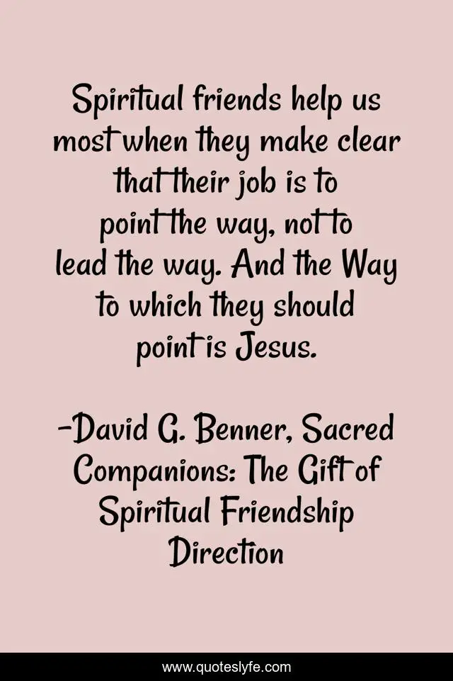 This page presents the quote "Spiritual friends help us most when they make clear that their job is to point the way, not to lead the way. And the Way to which they should point is Jesus.". Author of this quote is David G. Benner, Sacred Companions: The Gift of Spiritual Friendship Direction. This quote is about friends, spiritual-friends, jesus,.