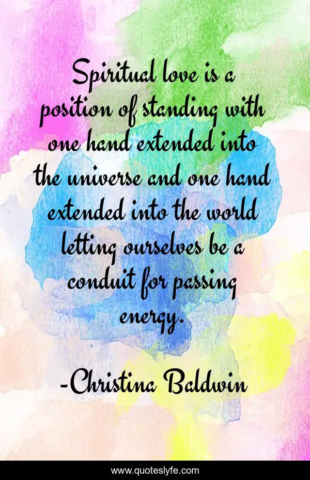 This page presents the quote "Spiritual love is a position of standing with one hand extended into the universe and one hand extended into the world letting ourselves be a conduit for passing energy.". Author of this quote is Christina Baldwin. This quote is about faith, unity,.
