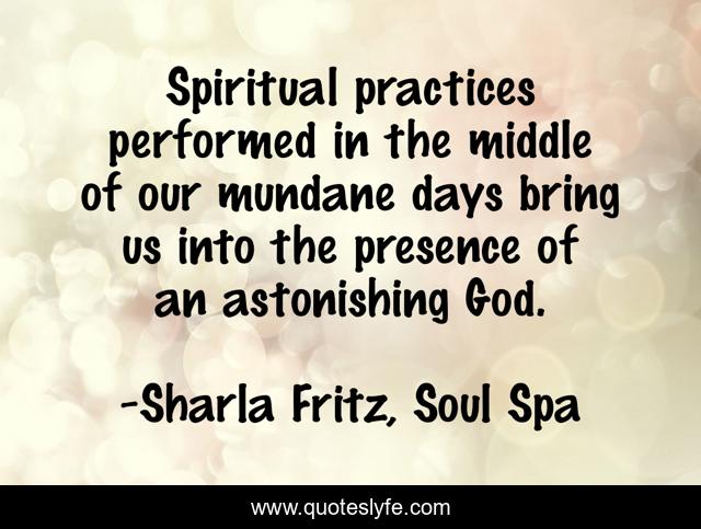 This page presents the quote "Spiritual practices performed in the middle of our mundane days bring us into the presence of an astonishing God.". Author of this quote is Sharla Fritz, Soul Spa. This quote is about spirituality-christian-life, spiritual, spiritual-wisdom, spirituality, presence-of-god,.