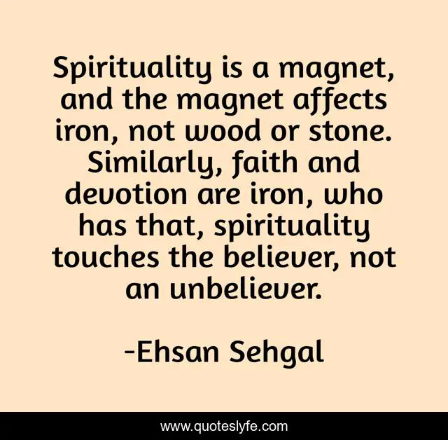 This page presents the quote "Spirituality is a magnet, and the magnet affects iron, not wood or stone. Similarly, faith and devotion are iron, who has that, spirituality touches the believer, not an unbeliever.". Author of this quote is Ehsan Sehgal. .