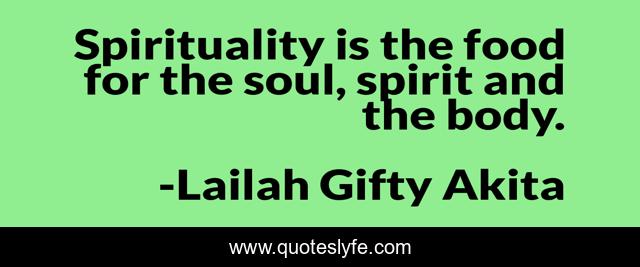 This page presents the quote "Spirituality is the food for the soul, spirit and the body.". Author of this quote is Lailah Gifty Akita. This quote is about spirituality, healthy-living, soul, inspirational, enthusiasm,.