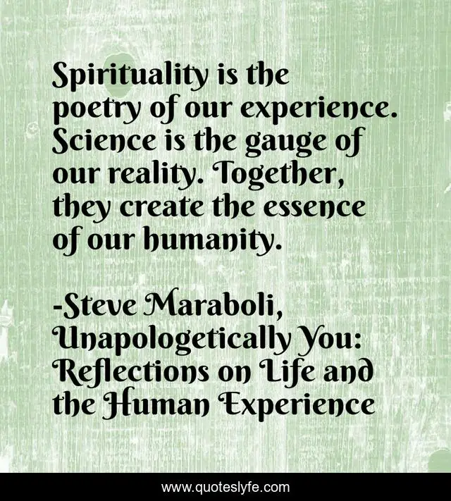 This page presents the quote "Spirituality is the poetry of our experience. Science is the gauge of our reality. Together, they create the essence of our humanity.". Author of this quote is Steve Maraboli, Unapologetically You: Reflections on Life and the Human Experience. This quote is about spirituality, experience, humanity, science-reality, poetry,.
