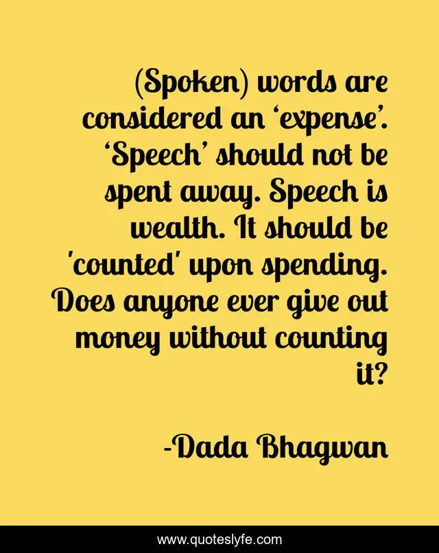 This page presents the quote "(Spoken) words are considered an ‘expense’. ‘Speech’ should not be spent away. Speech is wealth. It should be 'counted' upon spending. Does anyone ever give out money without counting it?". Author of this quote is Dada Bhagwan. This quote is about spending, spiritual, expense, speech,.