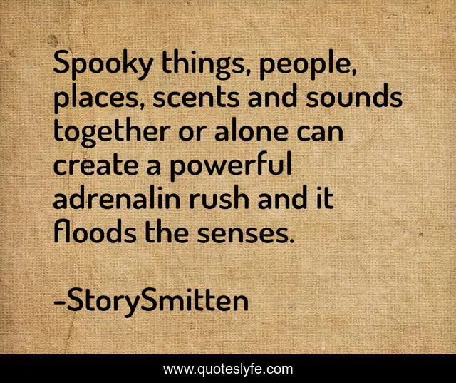 This page presents the quote "Spooky things, people, places, scents and sounds together or alone can create a powerful adrenalin rush and it floods the senses.". Author of this quote is StorySmitten. This quote is about mystery, romance, folklore, paranormal, thriller,.