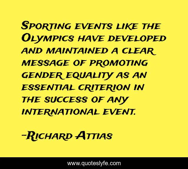 This page presents the quote "Sporting events like the Olympics have developed and maintained a clear message of promoting gender equality as an essential criterion in the success of any international event.". Author of this quote is Richard Attias. This quote is about gender, message, success,.