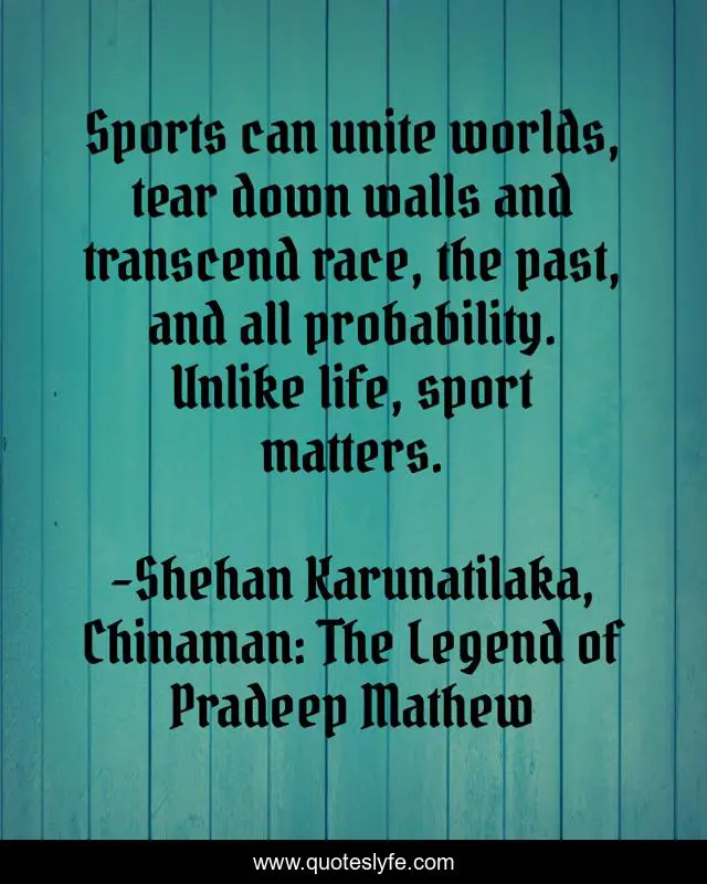 This page presents the quote "Sports can unite worlds, tear down walls and transcend race, the past, and all probability. Unlike life, sport matters.". Author of this quote is Shehan Karunatilaka, Chinaman: The Legend of Pradeep Mathew. This quote is about enthusiasm, inspirational, sports,.