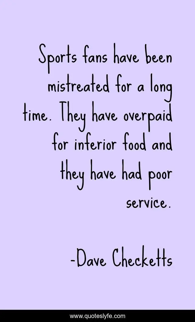 This page presents the quote "Sports fans have been mistreated for a long time. They have overpaid for inferior food and they have had poor service.". Author of this quote is Dave Checketts. This quote is about food, service, time,.