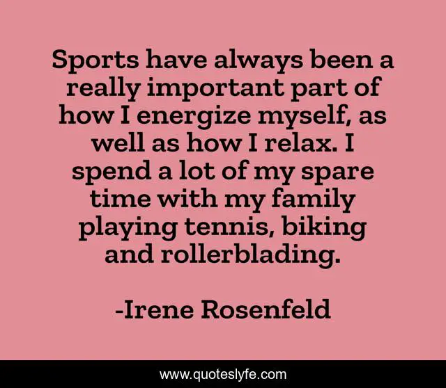 This page presents the quote "Sports have always been a really important part of how I energize myself, as well as how I relax. I spend a lot of my spare time with my family playing tennis, biking and rollerblading.". Author of this quote is Irene Rosenfeld. This quote is about myself, family, time,.