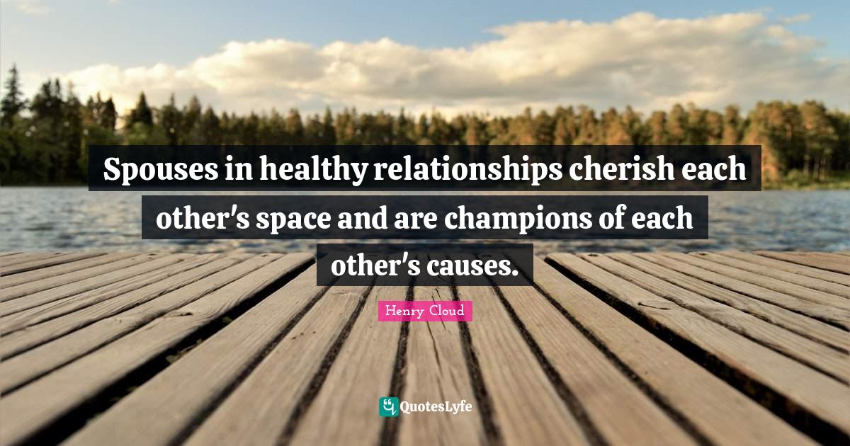 This page presents the quote "Spouses in healthy relationships cherish each other's space and are champions of each other's causes.". Author of this quote is Henry Cloud. This quote is about champion, cherish, space, healthy, causes,.