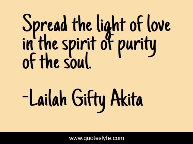 This page presents the quote "Spread the light of love in the spirit of purity of the soul.". Author of this quote is Lailah Gifty Akita. This quote is about inspiring, lovers, shine-your-light, wise-sayings, spiritual, purity, soul-mate, shining-star,.