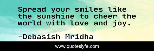 This page presents the quote "Spread your smiles like the sunshine to cheer the world with love and joy.". Author of this quote is Debasish Mridha. This quote is about life, love, knowledge, inspirational, intelligence, philosophy, wisdom, quotes, affection,.