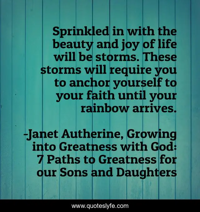 This page presents the quote "Sprinkled in with the beauty and joy of life will be storms. These storms will require you to anchor yourself to your faith until your rainbow arrives.". Author of this quote is Janet Autherine, Growing into Greatness with God: 7 Paths to Greatness for our Sons and Daughters. This quote is about strength-and-courage, faith, storms-of-life,.