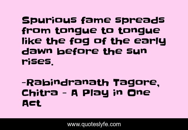 This page presents the quote "Spurious fame spreads from tongue to tongue like the fog of the early dawn before the sun rises.". Author of this quote is Rabindranath Tagore, Chitra - A Play in One Act. This quote is about tongue, fog, dawn, fame,.