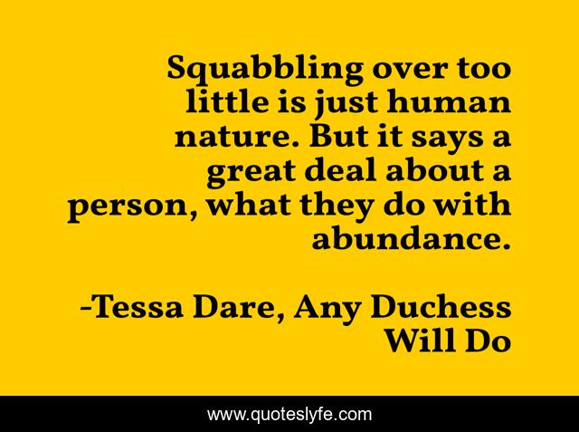 This page presents the quote "Squabbling over too little is just human nature. But it says a great deal about a person, what they do with abundance.". Author of this quote is Tessa Dare, Any Duchess Will Do. This quote is about abundance, human-nature, success,.