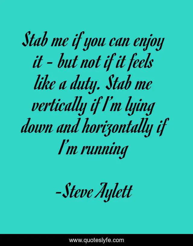 This page presents the quote "Stab me if you can enjoy it - but not if it feels like a duty. Stab me vertically if I’m lying down and horizontally if I’m running". Author of this quote is Steve Aylett. This quote is about life, humor, imagination, love, odd, affection,.