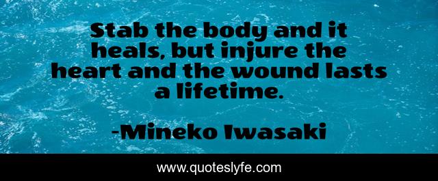 This page presents the quote "Stab the body and it heals, but injure the heart and the wound lasts a lifetime.". Author of this quote is Mineko Iwasaki. This quote is about heartbreak, betrayal,.