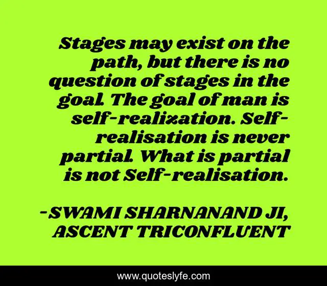 This page presents the quote "Stages may exist on the path, but there is no question of stages in the goal. The goal of man is self-realization. Self-realisation is never partial. What is partial is not Self-realisation.". Author of this quote is SWAMI SHARNANAND JI, ASCENT TRICONFLUENT. This quote is about self-realization, spirituality,.