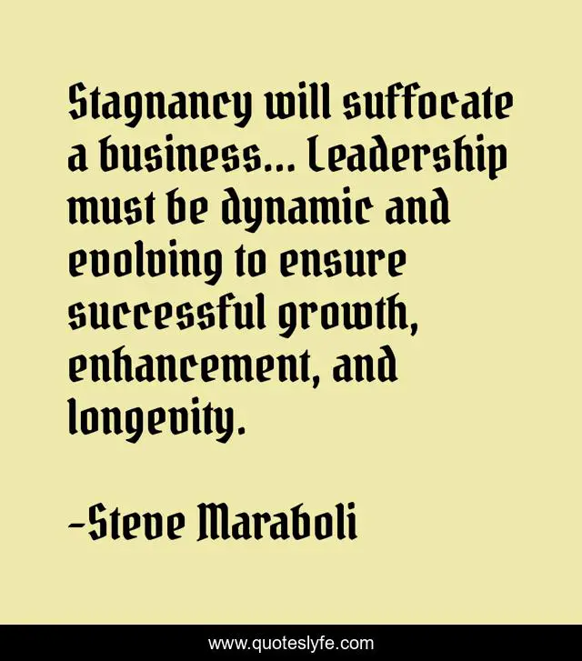 This page presents the quote "Stagnancy will suffocate a business… Leadership must be dynamic and evolving to ensure successful growth, enhancement, and longevity.". Author of this quote is Steve Maraboli. This quote is about leadership, business, success,.