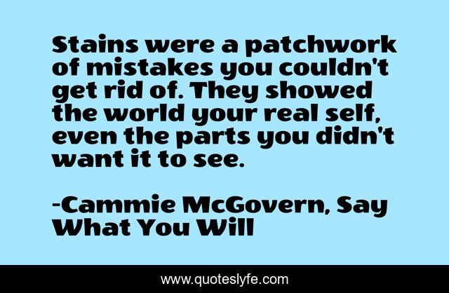 This page presents the quote "Stains were a patchwork of mistakes you couldn't get rid of. They showed the world your real self, even the parts you didn't want it to see.". Author of this quote is Cammie McGovern, Say What You Will. This quote is about life, mistakes,.