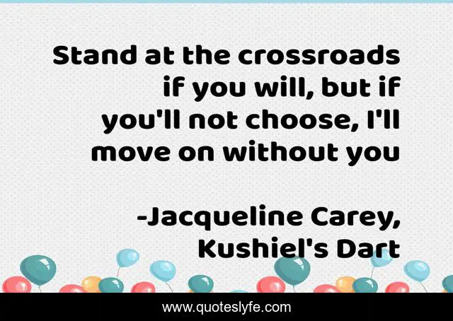 This page presents the quote "Stand at the crossroads if you will, but if you'll not choose, I'll move on without you". Author of this quote is Jacqueline Carey, Kushiel's Dart. This quote is about choice, wait, crossroads,.