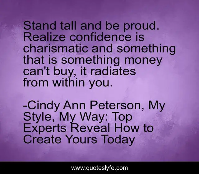 This page presents the quote "Stand tall and be proud. Realize confidence is charismatic and something that is something money can't buy, it radiates from within you.". Author of this quote is Cindy Ann Peterson, My Style, My Way: Top Experts Reveal How to Create Yours Today. This quote is about confidence, branding, positivity, motivational, style, wisdom, charisma, goals, positive,.