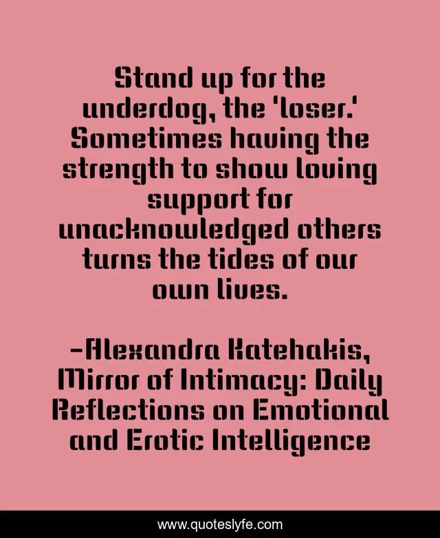 This page presents the quote "Stand up for the underdog, the 'loser.' Sometimes having the strength to show loving support for unacknowledged others turns the tides of our own lives.". Author of this quote is Alexandra Katehakis, Mirror of Intimacy: Daily Reflections on Emotional and Erotic Intelligence. This quote is about failure, support, underdog, loser,.