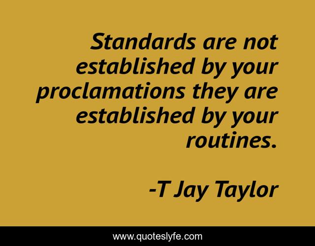 This page presents the quote "Standards are not established by your proclamations they are established by your routines.". Author of this quote is T Jay Taylor. This quote is about behaviour, team-management, business-leader, setting-standards, success, team-building, expectations, standards, workplace-culture,.