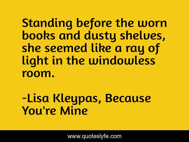This page presents the quote "Standing before the worn books and dusty shelves, she seemed like a ray of light in the windowless room.". Author of this quote is Lisa Kleypas, Because You're Mine. .