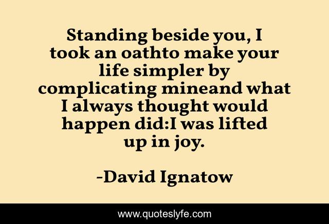This page presents the quote "Standing beside you, I took an oathto make your life simpler by complicating mineand what I always thought would happen did:I was lifted up in joy.". Author of this quote is David Ignatow. This quote is about joy, life, love, affection,.