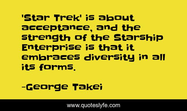 This page presents the quote "'Star Trek' is about acceptance, and the strength of the Starship Enterprise is that it embraces diversity in all its forms.". Author of this quote is George Takei. This quote is about diversity, acceptance, star,.