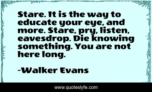 This page presents the quote "Stare. It is the way to educate your eye, and more. Stare, pry, listen, eavesdrop. Die knowing something. You are not here long.". Author of this quote is Walker Evans. This quote is about art, photography, creativity,.
