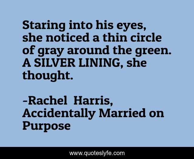 This page presents the quote "Staring into his eyes, she noticed a thin circle of gray around the green. A SILVER LINING, she thought.". Author of this quote is Rachel Harris, Accidentally Married on Purpose. This quote is about country-music, contemporary-romance, sweet,.