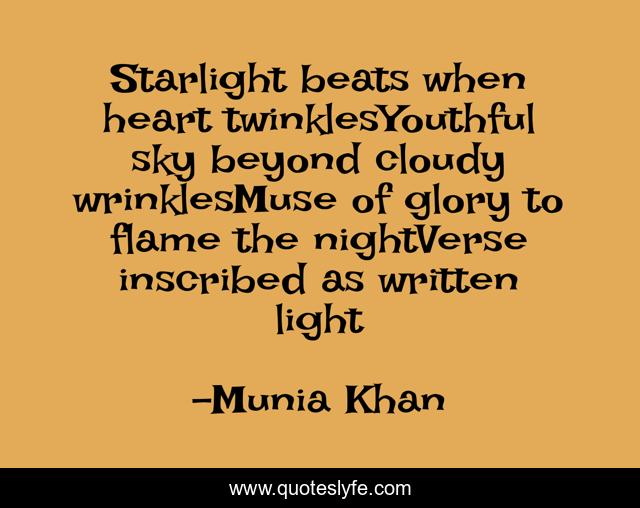 This page presents the quote "Starlight beats when heart twinklesYouthful sky beyond cloudy wrinklesMuse of glory to flame the nightVerse inscribed as written light". Author of this quote is Munia Khan. This quote is about heart, twinkled, twinkle, sky, poetry, verse, stars, nightsky, star,.