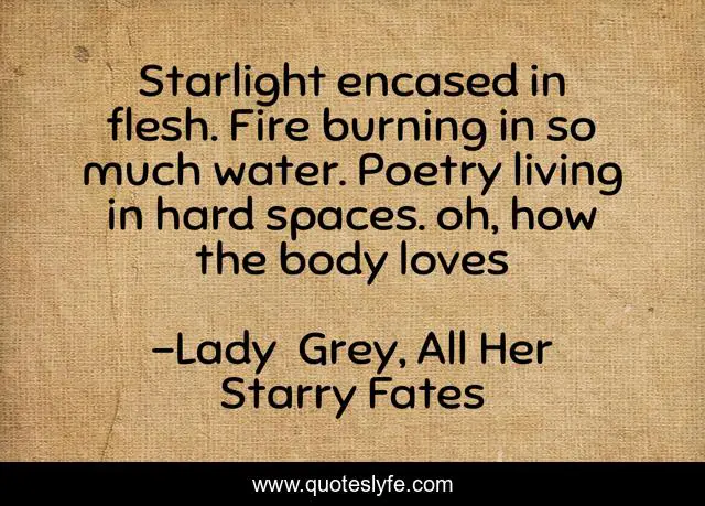 This page presents the quote "Starlight encased in flesh. Fire burning in so much water. Poetry living in hard spaces. oh, how the body loves". Author of this quote is Lady Grey, All Her Starry Fates. This quote is about body, love, poetry, alchemy, fiery, paradox, affection,.