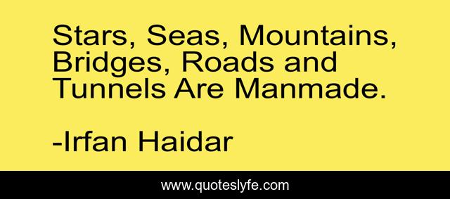 This page presents the quote "Stars, Seas, Mountains, Bridges, Roads and Tunnels Are Manmade.". Author of this quote is Irfan Haidar. This quote is about bridges, human, riads, mountains, seas, manmade, development-technology, stars, world,.