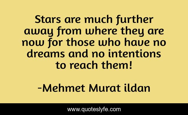 This page presents the quote "Stars are much further away from where they are now for those who have no dreams and no intentions to reach them!". Author of this quote is Mehmet Murat ildan. This quote is about star, intention, away, reach, reaching-out, intentions, stars, now, dream,.