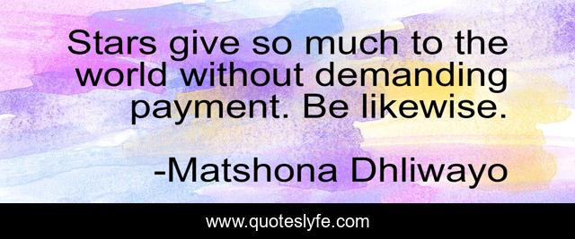 "Matshona Dhliwayo Quotes." Quoteslyfe.com, 2025. Fri. 05 Dec. 2025. <https://www.quoteslyfe.com/quote/Stars-give-so-much-to-the-world-14910>.