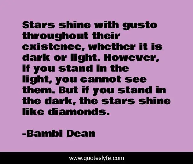 This page presents the quote "Stars shine with gusto throughout their existence, whether it is dark or light. However, if you stand in the light, you cannot see them. But if you stand in the dark, the stars shine like diamonds.". Author of this quote is Bambi Dean. This quote is about shine, perserverance, darkness, light, dark, stars,.