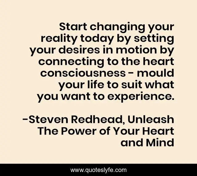 This page presents the quote "Start changing your reality today by setting your desires in motion by connecting to the heart consciousness - mould your life to suit what you want to experience.". Author of this quote is Steven Redhead, Unleash The Power of Your Heart and Mind. This quote is about life, heart-consciousness, desires, experience, reality,.