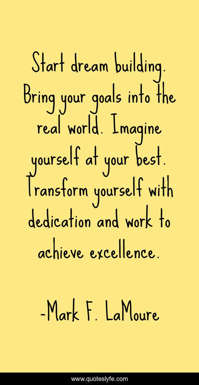 This page presents the quote "Start dream building. Bring your goals into the real world. Imagine yourself at your best. Transform yourself with dedication and work to achieve excellence.". Author of this quote is Mark F. LaMoure. This quote is about life, success, positive, excellent-people, excellent, confidence, excellence, self-improvement, inspirational,.