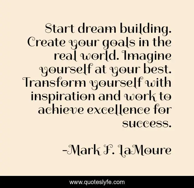 This page presents the quote "Start dream building. Create your goals in the real world. Imagine yourself at your best. Transform yourself with inspiration and work to achieve excellence for success.". Author of this quote is Mark F. LaMoure. This quote is about life, success, positive, excellent-people, excellent, confidence, excellence, self-improvement, inspirational,.