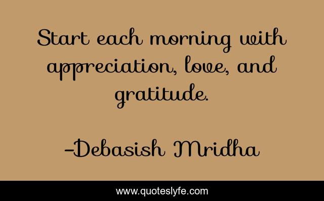 This page presents the quote "Start each morning with appreciation, love, and gratitude.". Author of this quote is Debasish Mridha. This quote is about gratitude, miraboli, oscar-wilde, philosophy, debasish-mridha, tagore, quotes, buddha, debasish-mridha-md,.
