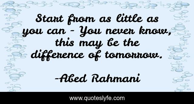 This page presents the quote "Start from as little as you can - You never know, this may be the difference of tomorrow.". Author of this quote is Abed Rahmani. This quote is about difference, future,.