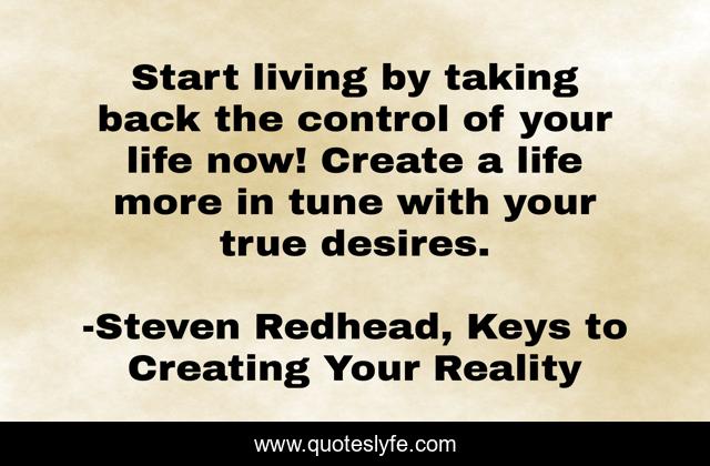 This page presents the quote "Start living by taking back the control of your life now! Create a life more in tune with your true desires.". Author of this quote is Steven Redhead, Keys to Creating Your Reality. This quote is about control, living, life, create, true-desires, taking-back,.