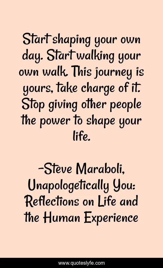 This page presents the quote "Start shaping your own day. Start walking your own walk. This journey is yours, take charge of it. Stop giving other people the power to shape your life.". Author of this quote is Steve Maraboli, Unapologetically You: Reflections on Life and the Human Experience. This quote is about life, success, power, positive, motivational, confidence, optimistic, inspirational, enthusiasm,.